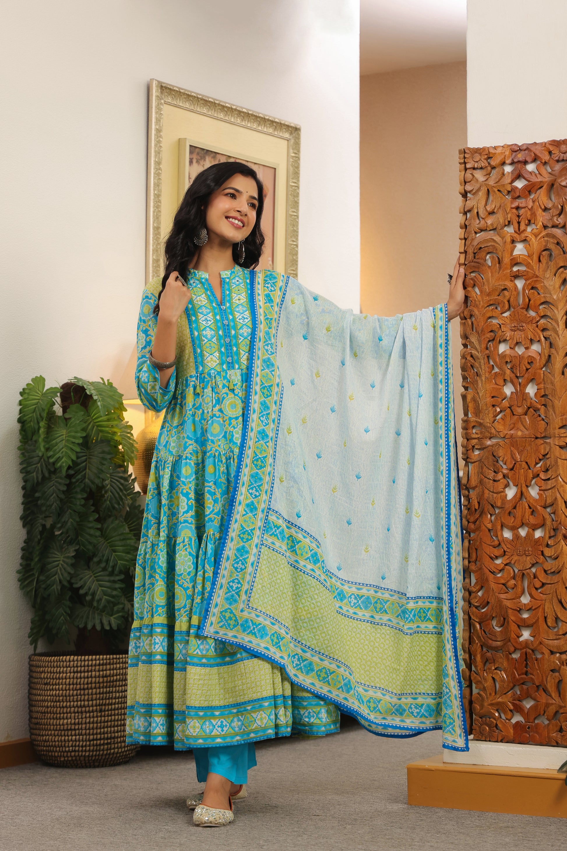 Add a refreshing touch to your ethnic wardrobe with our Blue-Green Cotton Anarkali, beautifully detailed with flowery prints. Made from 100% pure cotton, this Anarkali offers unmatched comfort, breathability, and elegance, perfect for long days and warm weather.
